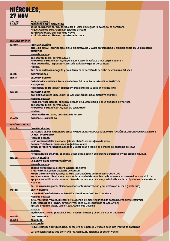 Este foro, se trata de una iniciativa única liderada y coorganizada por ACAVe, UNAV e ICAB (Ilustre Colegio de la Abogacía de Barcelona), que une la experiencia profesional turística y legal, dando lugar a un espacio único para debatir y analizar las cuestiones legales de máxima actualidad que afectan al sector turístico y muy especialmente a las agencias de viajes.